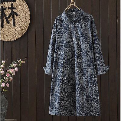 シャツワンピース チュニック レディース 春秋トップス 夏 長袖 大きいサイズ ロングシャツ ワンピース 膝丈ワンピース 花柄ワンピース 総柄 かわいい 折襟 ゆったり 体型カバー 着痩せ シンプル