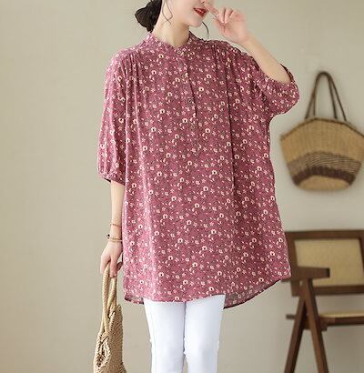 チュニック 花柄 ブラウス 半袖 レディース シャツ ロング丈 タック ギャザー シャツブラウス パフスリーブ スタンドカラー ボタン ゴム 綿麻風 トップス ゆったり 大きいサイズ 無地 きれいめ
