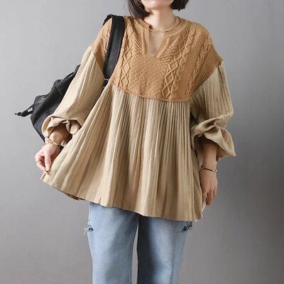 切替 チュニック レディース 長袖 異素材 ニット フレア 切替シャツチュニック 膝丈ワンピース トップス チュニックワンピース 春 秋 冬 大人可愛い お洒落 キレイめ ゆったり 体型カバー 着回
