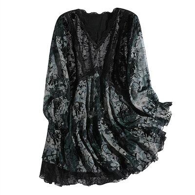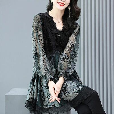 チュニック 切替 レース ブラウス レディース 長袖 カットソー 切り替え ベロア レース トップス フレア裾 vネック 長袖tシャツ 華やか 刺繍 きれいめ 通勤 着痩せ 大きいサイズ ゆったり オ