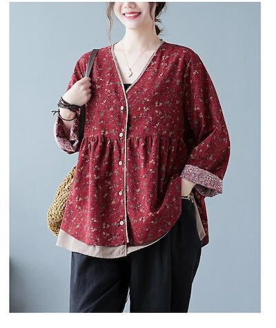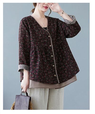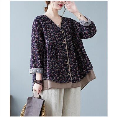 チュニック 大人可愛い シャツ ブラウス 長袖 秋 春 花柄 レディース Vネック 花柄シャツ 綿麻風 チュニック レイヤード風 トップス 総柄 森ガール キレイめ 大きいサイズ 体型カバー ゆったり