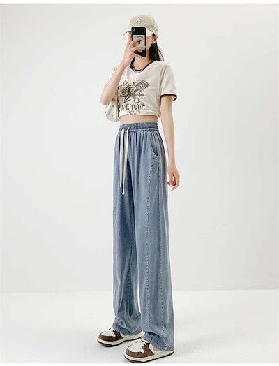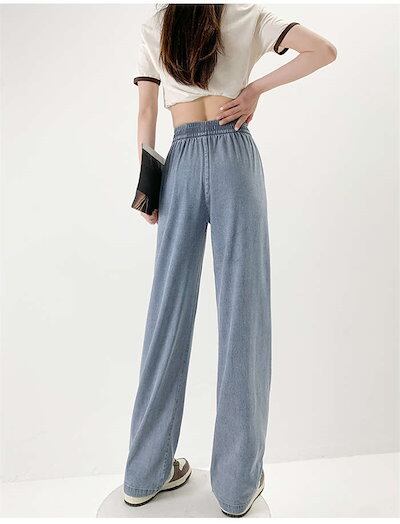 24新作 デニムパンツ レディース パンツ 冷感 ワイドパンツ ワイド デニム ストレッチ ストレート ボトムス 吸汗 速乾 通気 UVカット 涼しい ウエストゴム ハイウエスト ポケット ゆ