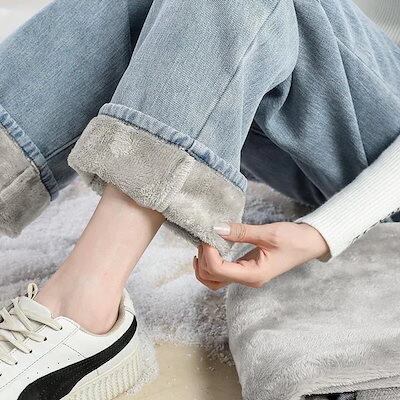 デニムパンツ 裏起毛 厚手 ワイドパンツ 新作 レジャー ゆったり ハイウエスト 細い ストレート レディース 韓国ファッション