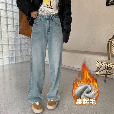 秋 冬 新作 裏起毛 デニムパンツ ロングパンツ レディース ワイドパンツ 裏起毛パンツ 体型カバー 着痩せ ゆったり 韓国ファッション