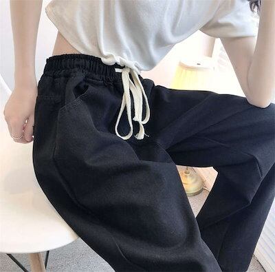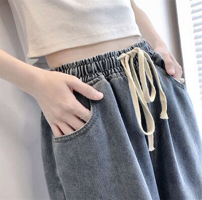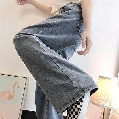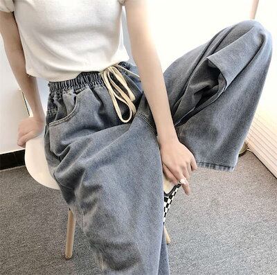ワイドパンツ デニムパンツ レディース ボトムス ポケット付 ストレッチ ズボン ロング丈 春 夏 無地 ひんやり ストレート ジーンズ ハイウエスト ウエストゴム ゆったり リラックス 大きいサイズ