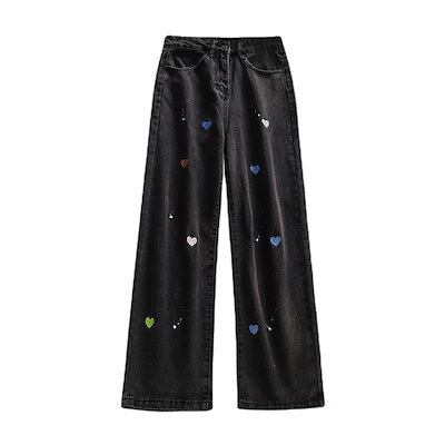 ストレート レトロ ハート ジョガ ーパンツ ジーンズ レディース ワイドパンツ ブラック デザイン感 刺繍