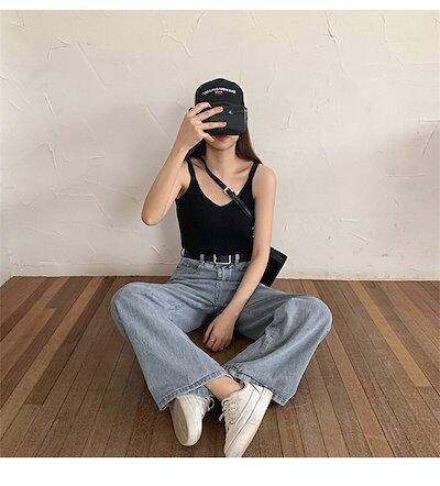 デニムパンツ ストレートパンツ レディース ボトムス ワイドパンツ パンツ デニム ロング ハイウエスト ウエストゴム ワイド ストレート ロングパンツ 春 夏 ジーンズ ポケット付き ゆったり 体型