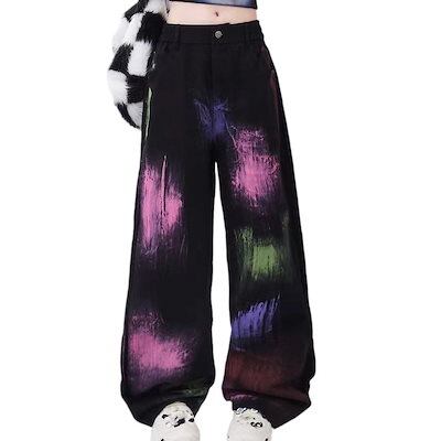 塗装プリント落書きジーンズアメリカレトロ創意百合カジュアルゆったりストレートワイド脚ズボンinsブーム