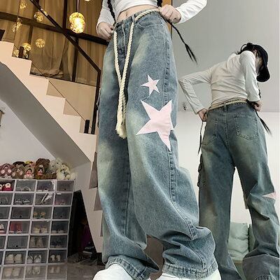 実際に梨の形をしたアメリカのレトロな星にジーンズを貼っている女性の高街ギャルのゆるいストレートパンツが湿っている
