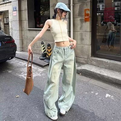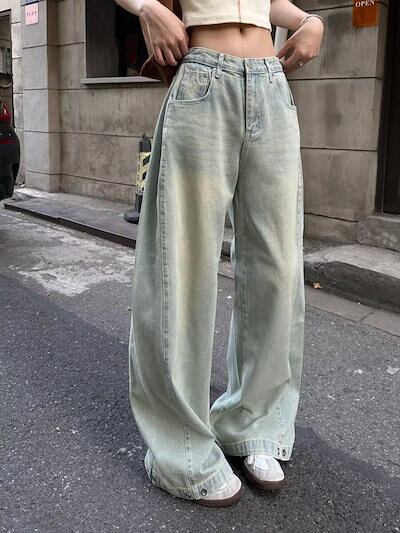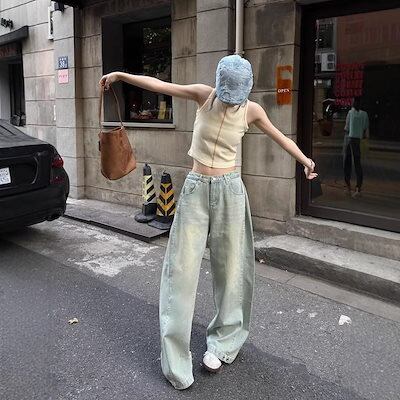 秋のモデルでは新しい明るい色が郭形の広い脚のジーンズをつなぎ合わせて水洗いして古い足のストレートなズボンの男女を作ることができる