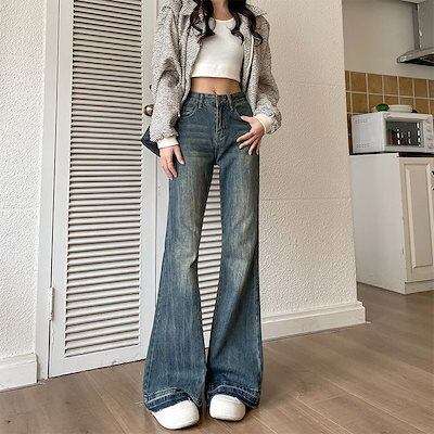 アメリカン レトロ マイクロ 大きいサイズ ジーンズ レディース 春秋 ハイウエスト 薄手 ゆったり ストレート ワイド フレア パンツ