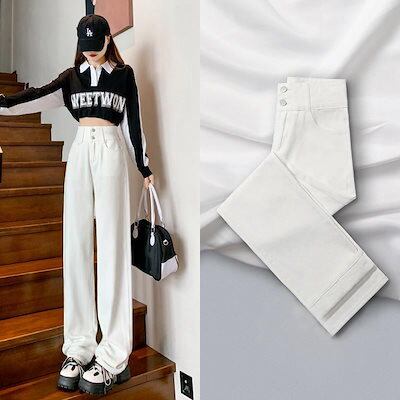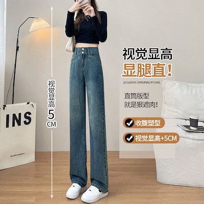 ハイウエストワイドジーンズレディースモデル新しい緩い薄い多目的なレトロストレートカバー股ドラッグパンツ