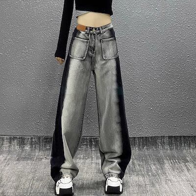 【3日以内出荷】脚長効果!デニムパンツ グレーブラック デザインセンス ハイウエスト ストレート レディース スキニー ワイドパンツ 韓国ファッション