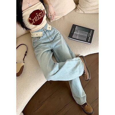 【3日以内出荷】脚長効果!デニムパンツ フラップ アルファベット レディース デザイン ニッチ ハイウエスト スキニー ワイドパンツ ストレート・パンツ 韓国ファッション