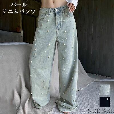 ワイドパンツ デニム レディース 春 秋 パール付き ガウチョパンツ ワイドデニム デニムパンツ 体型カバー ジーンズ ハイウェスト デニム ロングパンツ 大きいサイズ ロング丈 華奢見え おしゃれ