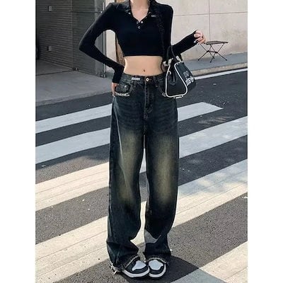 デニム レトロ ジーンズ レディース 春 新作 着痩せ モップパンツ ワイドパンツ