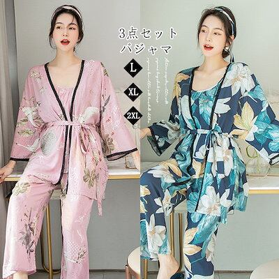 3点セット ガウン パジャマ レディース ルームウエア 綿シルク 通気性 花柄 可愛いパジャマ 綿 パジャマレディース 長袖 長ズボン キャミソール 上下セット 春 夏 可愛い レディースパジャマ 部