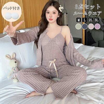 パジャマ 春夏 ルームウェア おしゃれ セットアップ ポリエステル 部屋着 長袖 ガウン トップス キャミソール ロングパンツ 長ズボン ナイトガウン 3点セット リブ 上下 セット レディース ナイ