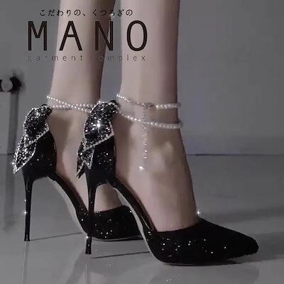 【MANO.上品】ブラックスワン ハイヒール ダイヤモンド飾り ピンヒール 黒鳥 蝶結び キラキラ 綺麗 上品 本革 レディース ヒールパンプス