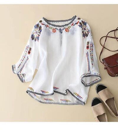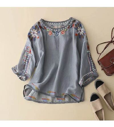 ブラウス シャツ 刺? 花柄 リネン混 レディース 夏 秋 春 7分袖 トップス Tシャツ 綿麻混 花柄 刺? クラシカル 大きいサイズ ゆったり オシャレ シンプル カジュアル 着回し 体型カバー