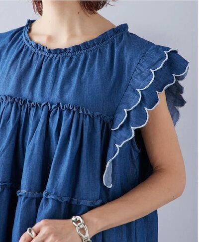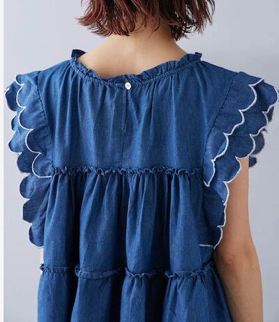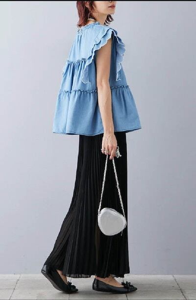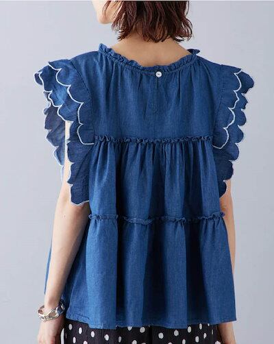 ブラウス レディース フリル袖 デニム ティアード トップス 切り替え Tシャツ デニム タンクトップ フレア袖 春 秋 夏 きれいめ カットソー ゆったり 可愛い お洒落 着回し抜群 カジュアル 体