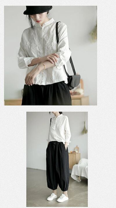綿麻 シャツ レディース 長袖 ブラウス 春 秋 冬 おしゃれ オフィス トップス 花柄 刺繍 白シャツ お洒落 コットン リネン ゆったり きれいめ 体型カバー 刺繍付き 前開き 春 秋 ショート丈