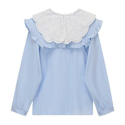 刺繍シャツ レディース 長袖シャツ 長袖 刺繍 ダブルドールカラー ボリューム袖 シャツ 切り替え フリル 透かし彫り ドッキング 前開き トップス 体型カバー ブラウス 白 ゆったり きれいめ おし