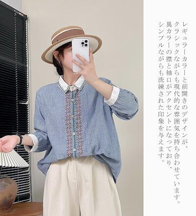 長袖シャツ レディース 刺繍 トップス 秋 シャツ シャツブラウス 春秋 ブラウス 春 ストライプ柄 ブルーシャツ オーバーサイズ 長袖 前後差あり ボタン付き 切り替え 折襟 体型カバー ゆったり