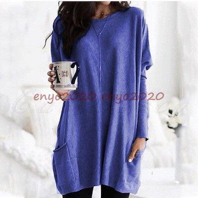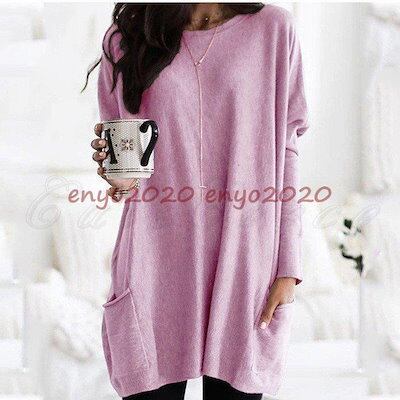 Tシャツ レディース カットソー 無地 丸首 ロング丈 長袖 トップス ポケット付き カジュアル チュニック 春秋 ゆったり かわいい おしゃれ