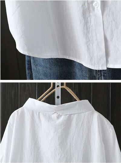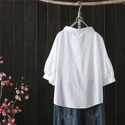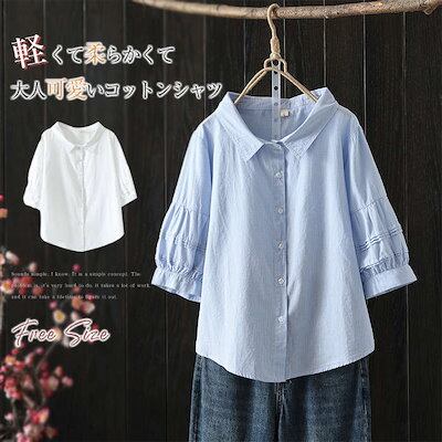 シャツ トップス レディース 半袖 無地 夏 5分袖 ブラウス シャツブラウス 半袖シャツ ホワイトシャツ 綿シャツ 白 バルーンスリーブ チュニック ゆったり シャツ 前開け 折襟 コットン 綿 シ
