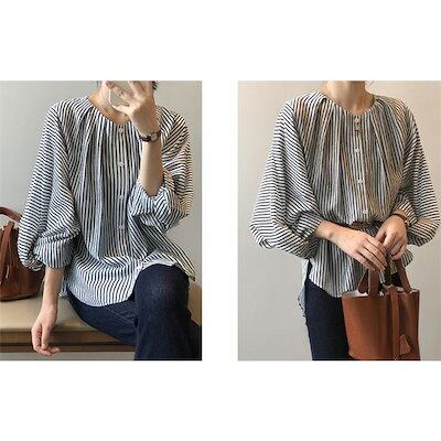ブラウス レディース 長袖 きれいめ 40代 春 夏 オシャレ シャツブラウス ストライプ柄 シャツ 長袖 トップス パフスリーブ 大人 通勤 ゆったり 可愛い