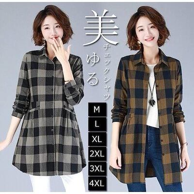 シャツブラウス ロングシャツ ブラウス トップス 長袖 折り襟 チェック柄 綿混 体型カバー レディース ロング丈 ゆったり 前開き オシャレ