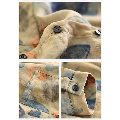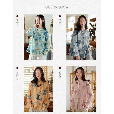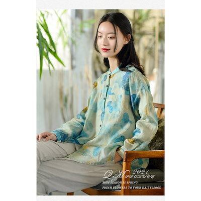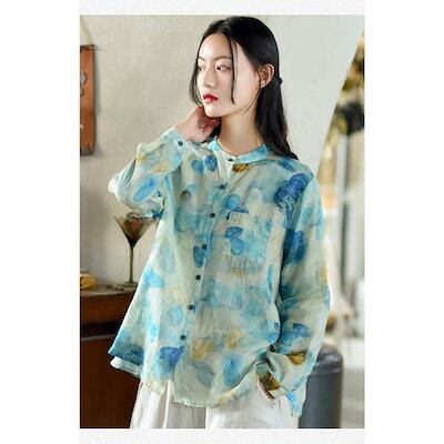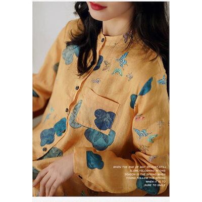 リネンシャツ 春夏 前開き ボタン留め シャツブラウス 総柄 フレア 立ち襟 トップス レディース 長袖 ゆったり カジュアル おしゃれ バックタック 30代 40代