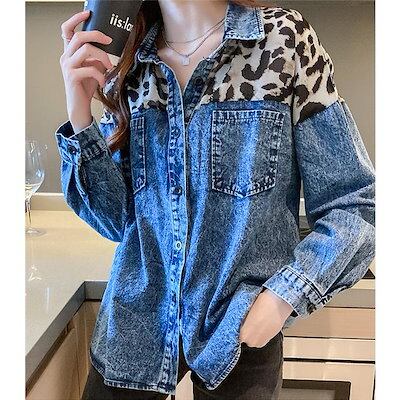 デニムシャツ レディース 長袖 シャツ トップス 豹柄 カジュアル Gジャン デニム アウター ゆったり ヒョウ柄 体型カバー 羽織 ジャケット