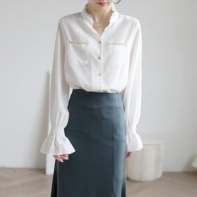 シャツ 初秋 韓国ファッション かわいい Vネックゴムスリーブホワイト 長袖着痩せ トップス シースルートップス ブラウス