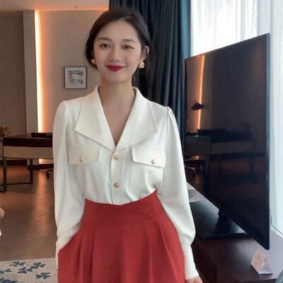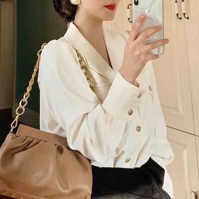 シャツ 初秋 韓国ファッション 新作長袖ホワイト薄手Vネックシャツ着痩せ トップス シースルートップス ブラウス