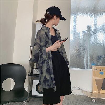 シャツ 秋新作 韓国ファッション ミドル丈プリント長袖日焼け止めシャツ着痩せuvカット トップス シースルートップス ブラウス