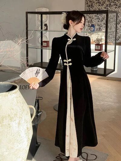 パーティードレス 2025春ロング丈高級チャイナドレス黒純欲気質痩せ見え長袖ウエストワンピース ドレス