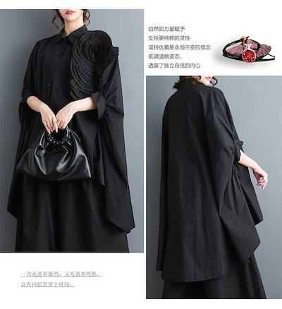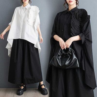「ファットガール」 2024夏 花飾り ブラウス 前短後長 コサージュ 無地 半袖 体型カバー チュニック ロングブラウス ロンT 大きいサイズ ゆったり レディース シフォンブラウス 母の日 メガ割
