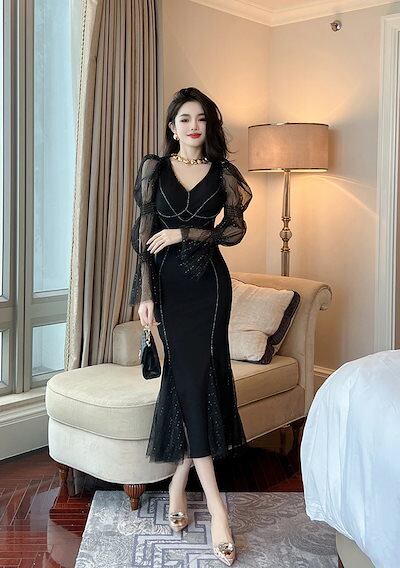 【JY.上品】 チュールワンピース 春秋 vネック マーメイド ドレス パーティー キャバ 着痩せ 大人 お呼ばれ 同窓会 披露宴 卒業式 結婚式 ウェディング 二次会 成人式