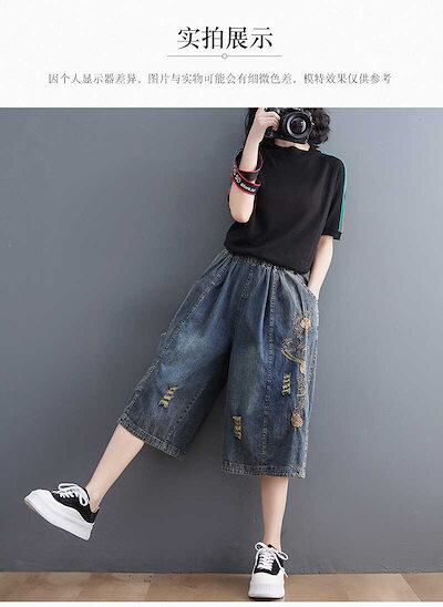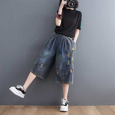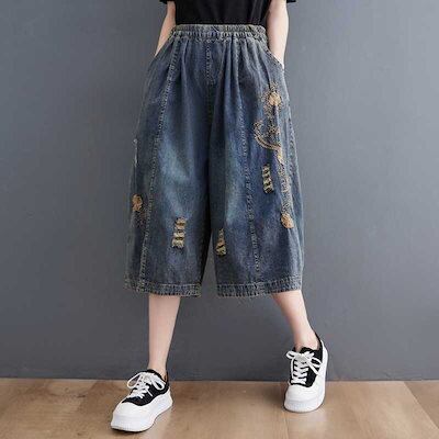 「ファットガール」 2024夏新品 七分丈 ワイドパンツ デニムパンツ ゴム 刺繍 大きいサイズ 体型カバー レディース パンツ メガ割