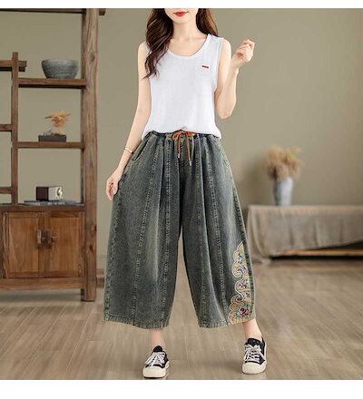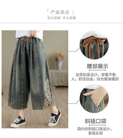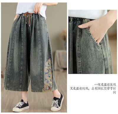 「ファットガール」 八分丈 デニムパンツ 刺繍 ワイドパンツ ゴム 体型カバー 大きいサイズ ゆったり レディース