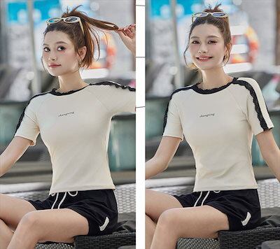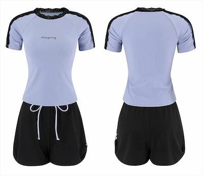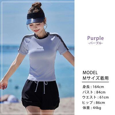 2025新作 水着 体型カバー レディース セパレート リブ 半袖 Tシャツ風 2点セット プルオーバー 肩レース ノンワイヤー パンツ ショーツ一体型 ロゴ ワンポイント サイドスリット風 パッド付