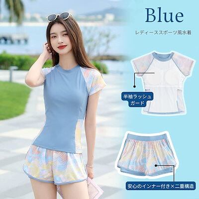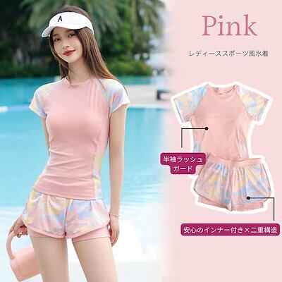 2025春夏新作 2点セット 水着 レディース フィットネス水着 半袖ラッシュガード 体型カバー スポーツ水着 運動水着 スポーティー水着 紫外線対策