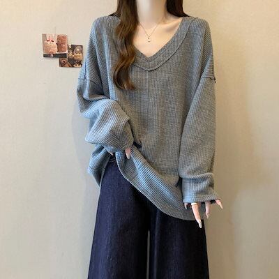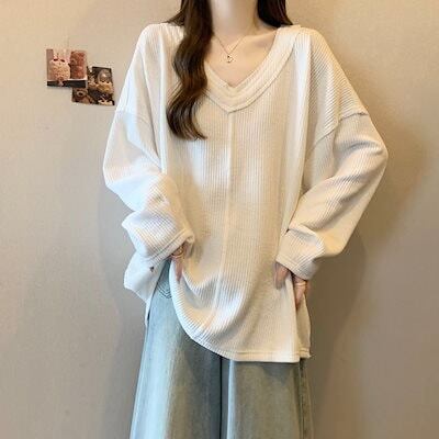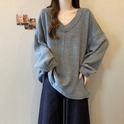 パーカー ストライプ デザイン感Vネック長袖トップス2024 秋 新作ゆったりおしゃれボトムTシャツ女