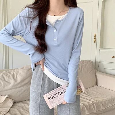 人气新作韓国ファッション秋新作 ロングTシャツ ボタンをつなぎ合わせる半開き襟長袖ぶつかり色Tシャツ女 韓国 スウェット トップス ティーシャツ ロンT 長袖 tシャツ