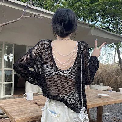 シースルートップス ゆったり背中見せパールチェーン長袖透かしニット OL 通勤 アイスシルク日焼け止めシースルートップス カーディガン