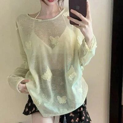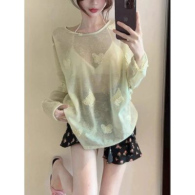 シースルートップス 長袖Tシャツ カーディガンOL 通勤 女性薄手サマーシースルートップスアイスシルク日焼け止めシャツクーラーブラウス