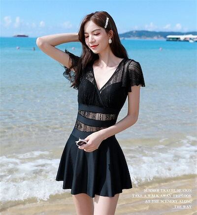 水着レディース ワンピース 黒 パッド付き ショートパンツ一体型 Vネック ワンピース水着 ワイヤー入り 小胸 体型カバー レース セクシー オールインワン 露出控えめ フィットネス スイムウェア み
