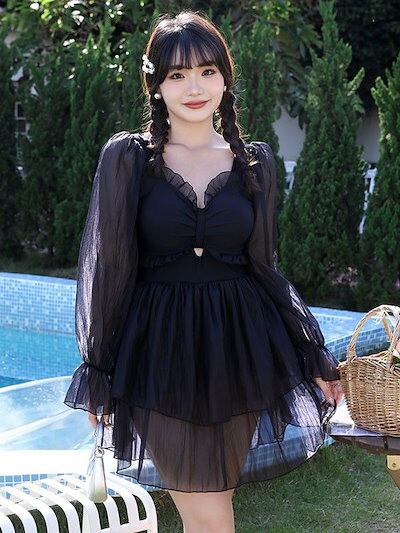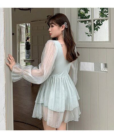 水着 レディース ワンピース 体型カバー 透け感 シアー感 ワイヤーなし 長袖 露出控えめ 大きいサイズ 着やせ ブラック グリーン ぽっちゃり 女性 スポーツ水着 海水浴 温泉 bi174zezez